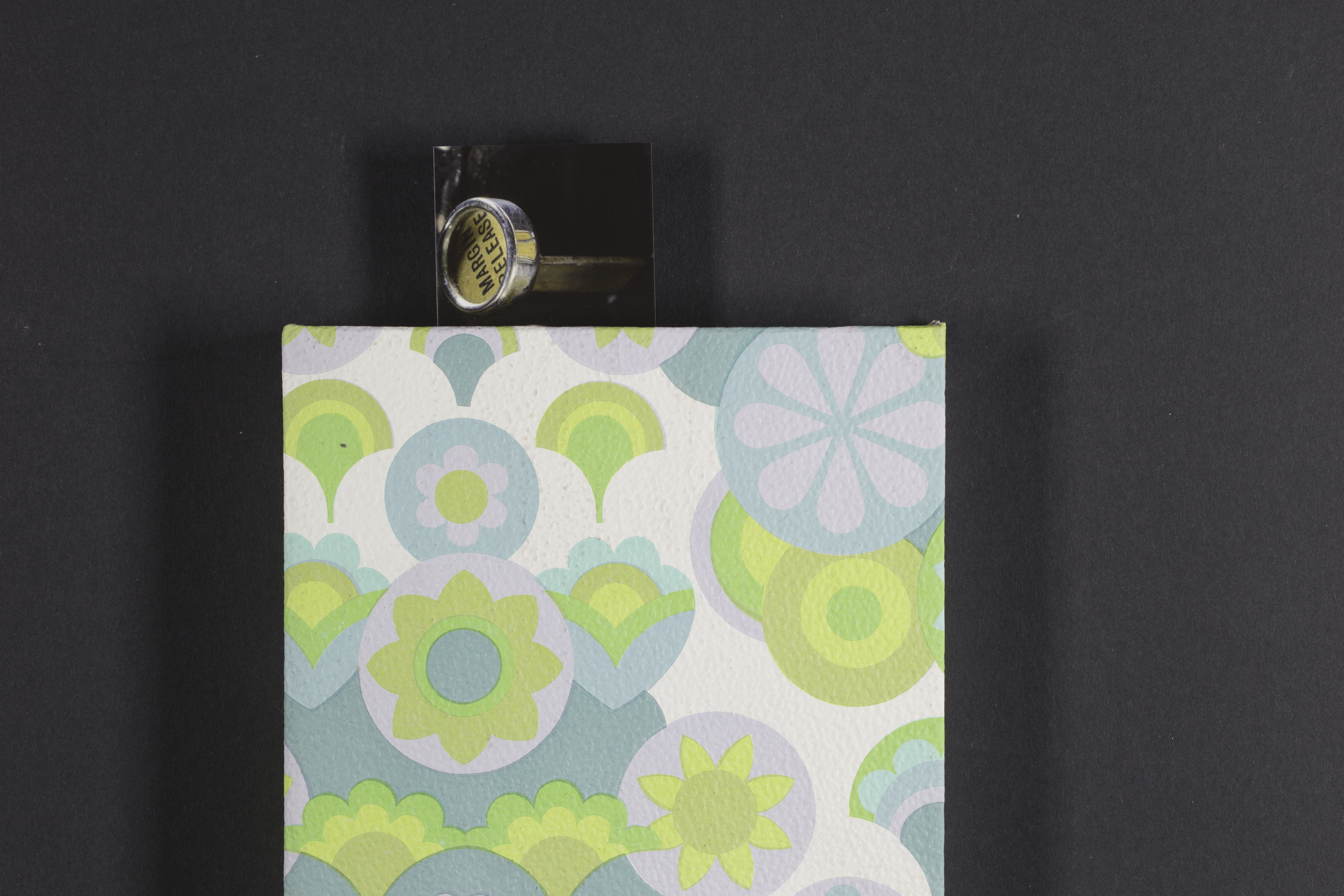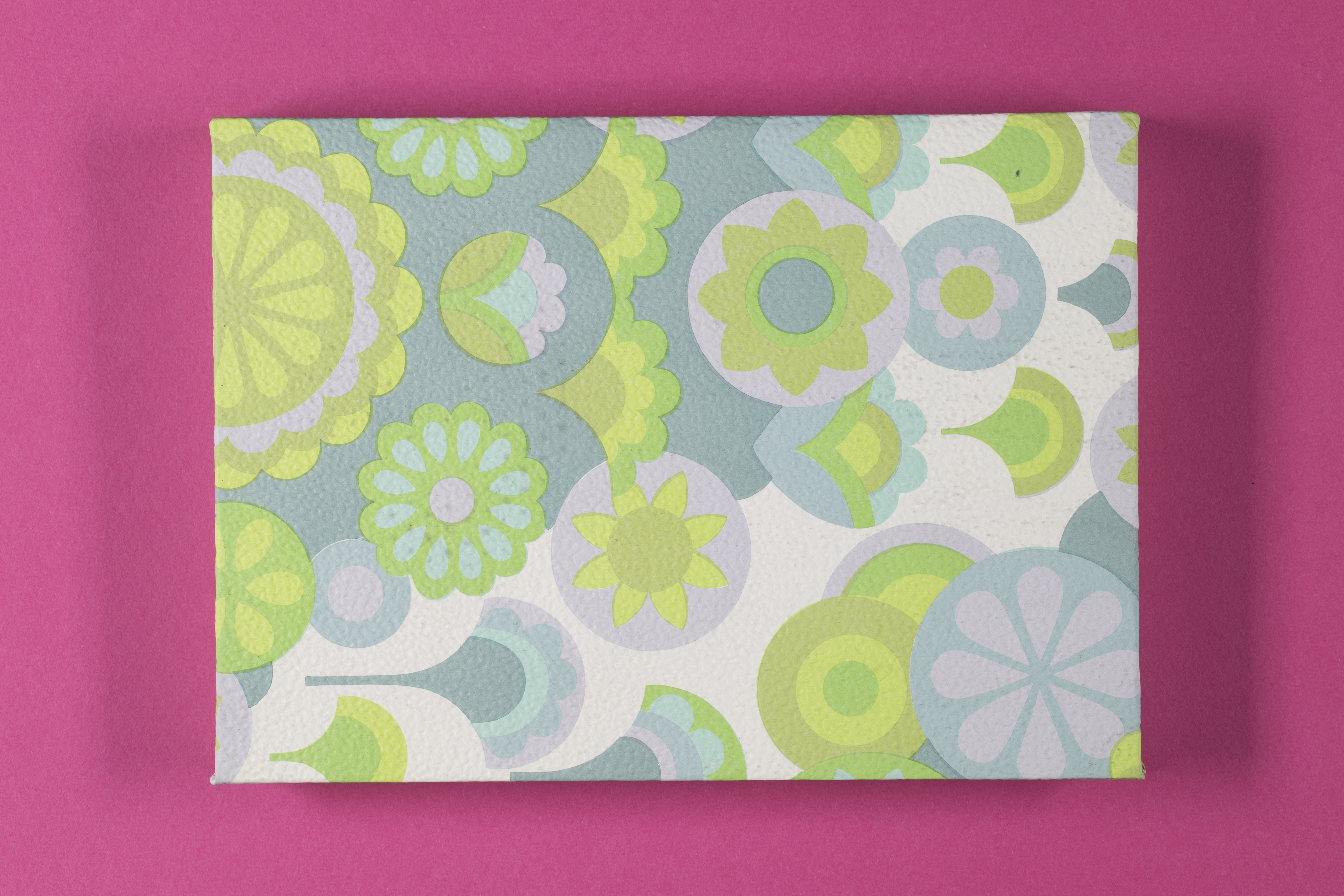 Dan komt er weer een tricky stuk. Nu meet je heel secuur de hoogte en breedte van het boekblok, en de breedte van de rug. Deze afmetingen teken je na op papier (of stof), dat zal dienen als boekomslag. Ik koos voor retro behangpapier, een vondst uit de kast van mijn grootmoeder. Je laat wat extra centimeters marge aan alle zijden. Waar het boek zal komen leg je alle onderdelen in stevig karton er als proefopstelling op.