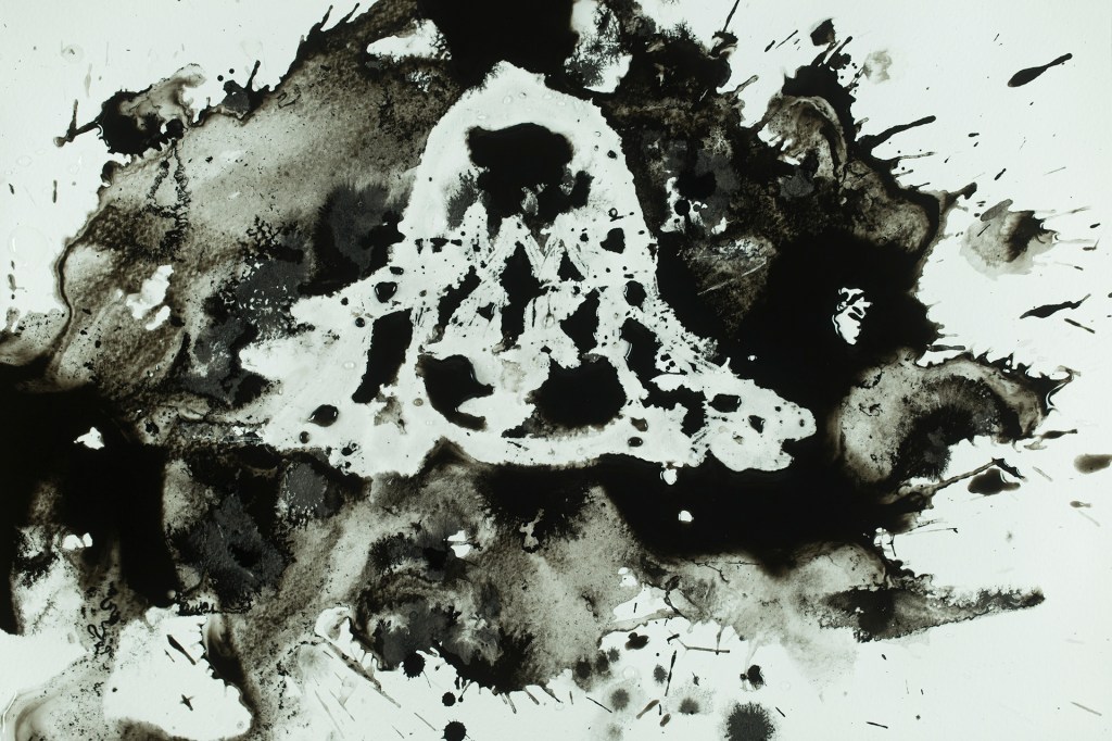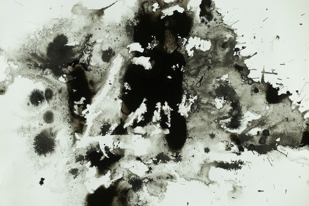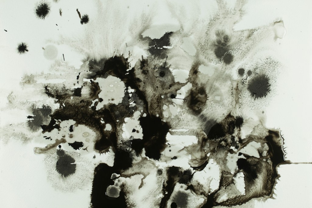 Ik experimenteerde met nat-in-nat vlekken in inkt, aquarel en ecoline en combineerde die met glitters en vette materialen voor uitsparingen als oliekrijt, kaarsvet, kokosolie en zonnebloemolie.