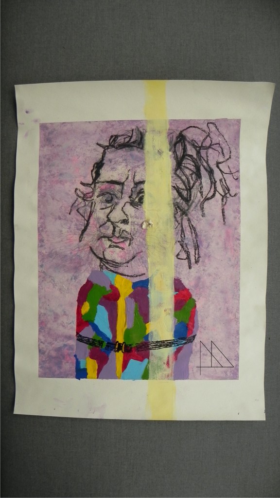 “The Ugly” – Potlood, paint wash, houtskool ononderbroken lijn met andere hand, acryl, stift, gevonden voorwerp (2023)
